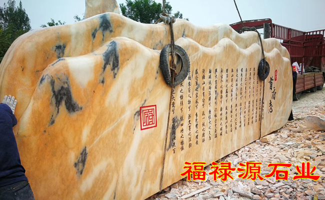 景觀石廠家臥式景觀石  熱烈祝賀!浙江省湖州市恒大首府,訂購長7.2米 高2.3米 厚0.4米晚霞紅刻字石,順利發車!