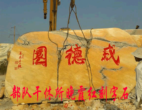這是我公司受托與一個部隊干休所,設計制造的一塊晚霞紅刻字石。客戶是在網上看到我們公司的之前做的案例,覺得我們公司做的不錯,然后給我們電話聯系。說明了大致的意向之后,我公司的工程設計的人員就開始挑選石材,在挑選好七塊不錯的石材之后,我們給客戶發去圖片,然后確定要那一塊石材。隨后開始設計文字的雕刻的工作,這塊晚霞紅刻字石作品出來以后,**覺得非常滿意。馬上要求吊裝上車進行安裝。