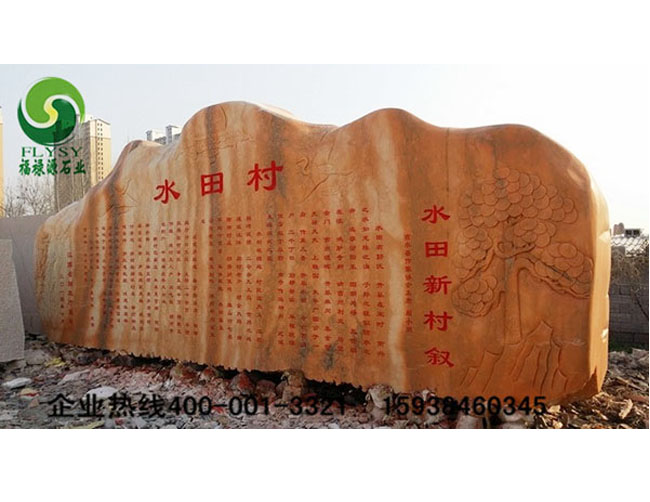 石無(wú)情而人有意,一方石載一段情。水田村這塊晚霞紅刻字石線條柔美,氣勢(shì)磅礴。似山巒一樣連綿起伏。自然成為水田村的益處景觀。這個(gè)大體呈長(zhǎng)方型、磨去了棱角、上方波浪狀的晚霞紅石長(zhǎng)長(zhǎng)8.7米,高3米,*上方刻有“水田村”三個(gè)大字,主體部分為《水田新村敘》一文,字里行間記述著水田村的久遠(yuǎn);周邊假山、古樹(shù)、飛鶴、祥云浮刻點(diǎn)綴。造型古樸大方。
